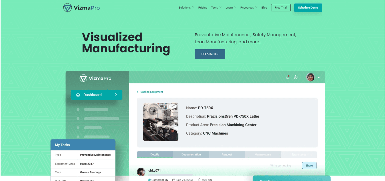 Its suite of tools enables manufacturers to implement lean principles, minimize waste, and boost productivity. VizmaPro offers solutions for safety management, document control, supplier oversight, training and skill development, equipment management, and preventative maintenance, making it a complete resource for manufacturers seeking to optimize processes and remain competitive.